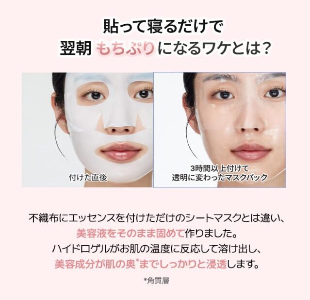 なんと美容液をそのまま固めて作られており、3時間以上貼りっぱなしにするタイプのパック!